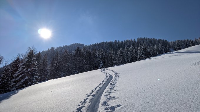 Ca. 50-100cm Schnee, an den Hängen vom Häderenberg noch kalt und pulvrig - geniale Verhältnisse, ja sogar den besten Run des Winters gehabt, was mich umgehend auf eine zweite Runde gelockt hat. Heute früh waren erst wenige Spuren drin, werden wohl noch einige dazukommen heute tagsüber.