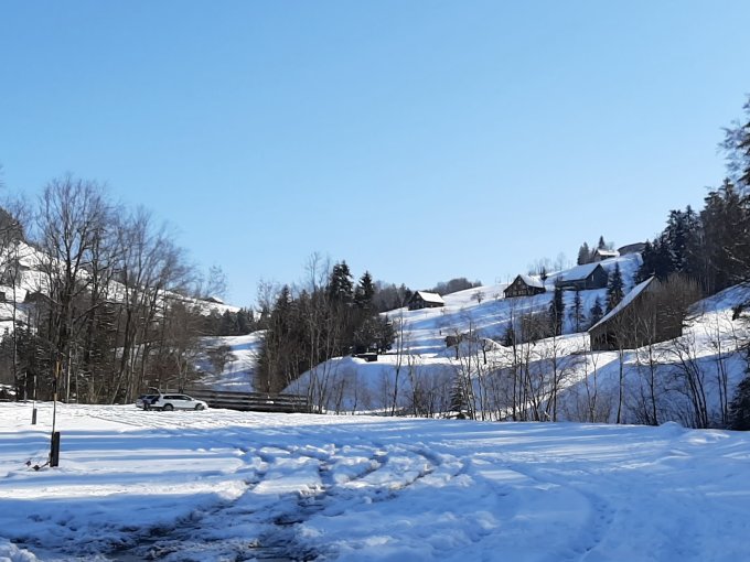 Es ist kaum vorstellbar, dass man in dieser Höhe (Sattel, ca.775 m ü.M.) Mitte März noch solch herrliche Schneeverhältnisse antrifft - und das gilt gleich für die ganze Tour. Das Besondere: Alle Anlagen sind geschlossen, die Tourengeher sind unter sich ;-)! Den Aufstieg nach Mostelberg kann man beleibig machen; ich bin via Ober Zanggeren - Zeigers Boden - Janseren nach Mostelberg gestiegen; von da an Richtung "Hals" hinauf zum Gipfel. Ein Tourenkollege hatte die (tolle) Idee, nachher noch via Banegg (1440 m) zum Hochstuckli (1565 m) zu wandern, ohne die Felle wegzunehmen. Die Abfahrt im (normalerweise) Pistengelände über die herrlichen Hänge im schönsten Pulverschnee war ganz einfach traumhaft!