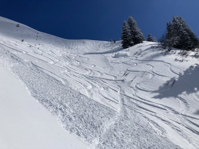 Sehr gute Bedingungen, einzig Gipfelhang etwas russisches Roulette, da abgeblasen und die Steine z.T. knapp mit Schnee bedeckt. Abfahrt Diretissima durch den Scheerizug, dieser mit Vorsicht zu befahren, die obersten 15cm konnten ausgelöst werden. Bei Erwärmung wirds da heikel. Schnee SW-seitig bereits etwas pappig. Nord- und Osthänge (Landvogte/Raufli-E) sind zur Zeit noch sehr heikel. Spontane grosse Staublawine vom Osthang oberhalb Fildrich gesichtet, ging bis in den Wald runter.