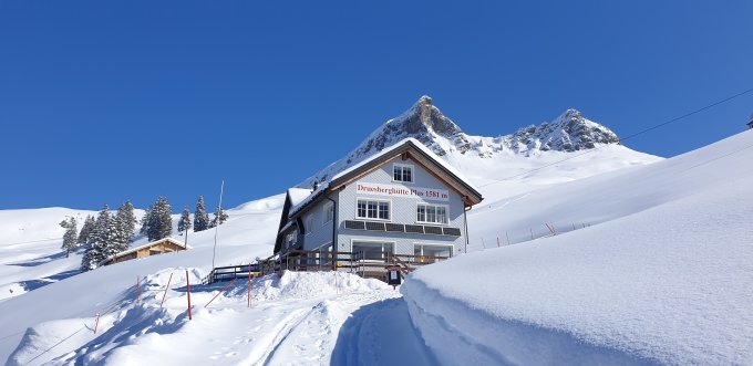 Start der Tour am 9.15 Uhr bei der Weglosen, die Temperatur heute sehr kalt mit - 8° , der Schlittelweg zur Druesberghütte war heute nicht präpariert, die Schlüsselstelle war heute auch ganz einfach, viel Pulverschnee ohne Windeinfluss auf der ganzen Route.