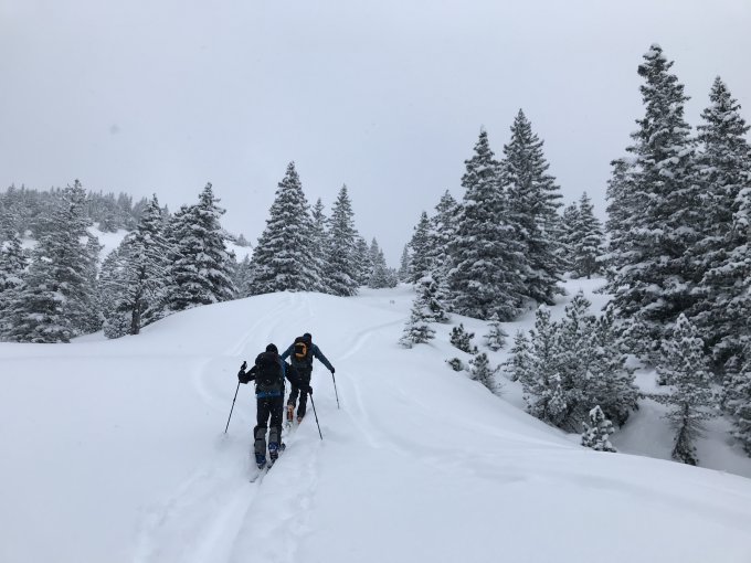 Viel Neuschnee im Gebiet. Guter Pulverschnee auf der ganzen Route. Bei den flacheren Stellen war das Vorankommen sogar schwierig.