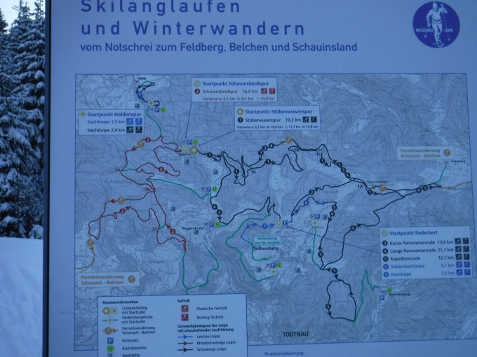 Die Rodelpiste, bzw. der Schneeschuhtrail vom Feldberg hinab zur Todtnauer Hütte war gewalzt, so dass ich von der Hütte den 15°steilen Aufstieg direkt vornahm und nicht über die Schleife zum Grüble, Grüblesattel und Franz-Klarmeyer-Weg zum Sendeturm lief, wie ich eigentlich geplant hatte. Selbst die südwestliche Piste hinab zur St.-Wilhelm-Hütte war gewalzt, so dass ich diese gut hinab kam. Vielen Dank dem Fahrer im Pistenbulli, der mir am Gipfel im Nebel entgegenkam !