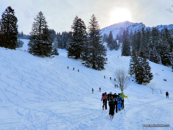 Abfahrt: Einstieg in den Nordhang über ca. 1 m hohe Wächte, gut machbar. Dann Traumpulver ohne Ende. Nur wenige alte Spuren zu unserer Überraschung. Von Gäsialp entlang des Wanderwegs nach Ammelin zurück. Von da via Hüttenberg über schöne offene Wiesen zum Parkplatz zurück.