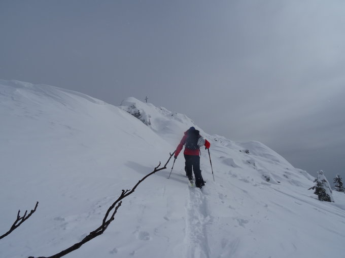 viel Schnee, ausreichend, auch um im Wald zwischen den Kehren abzufahren; Ostertal hat besten Pulver; auch Gurnwandkopf ging ganz gut; Wetter oben windig, Sicht ok;