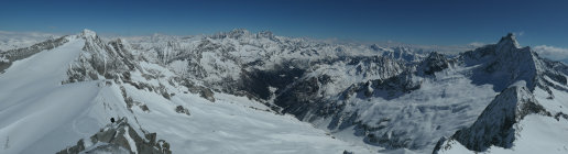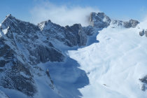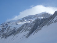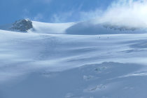Gletscherflanke zum Gipfel gut eingeschneit, reichlich Pulver leicht windgepresst. Gipfelbereich mit Lockerschnee zwischen grossen Blöcken, etwas ausgesetzt, für die letzten 20m Seilsicherung.