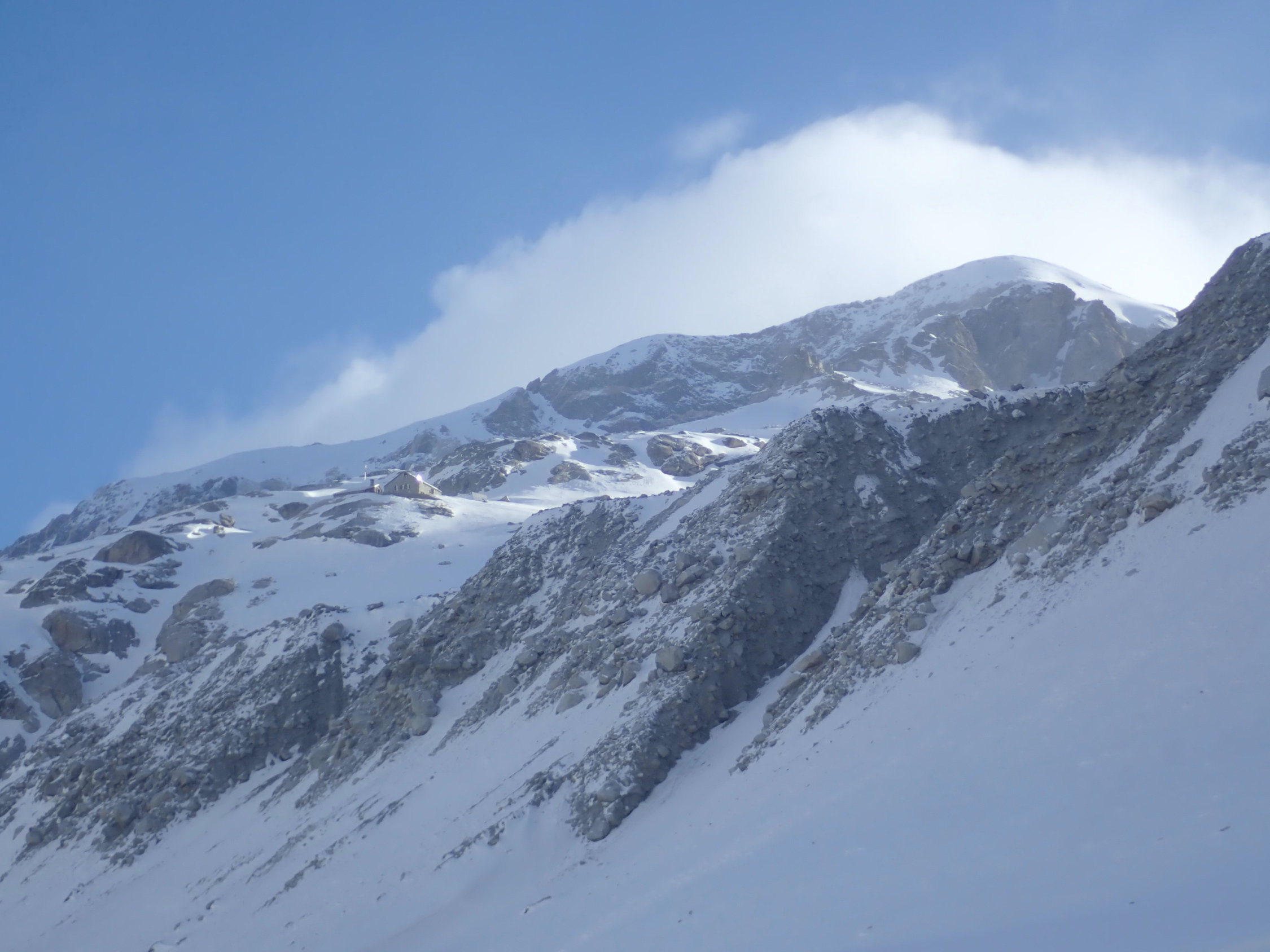 Die übliche Hüttenroute etwas südlich der Hütte wird derzeit in der Abfahrt nicht empfohlen, zu viel loses Material, Aufstieg in engen Spitzkehren möglich, oder 80 Hm zu Fuss, evtl. mit Steinschlaghelm. Dank Klimawandel liegt die Hütte inwischen 250Hm über dem Talgrund, im AKTUELLEN Skiführer GR ist noch von 180Hm die Rede.