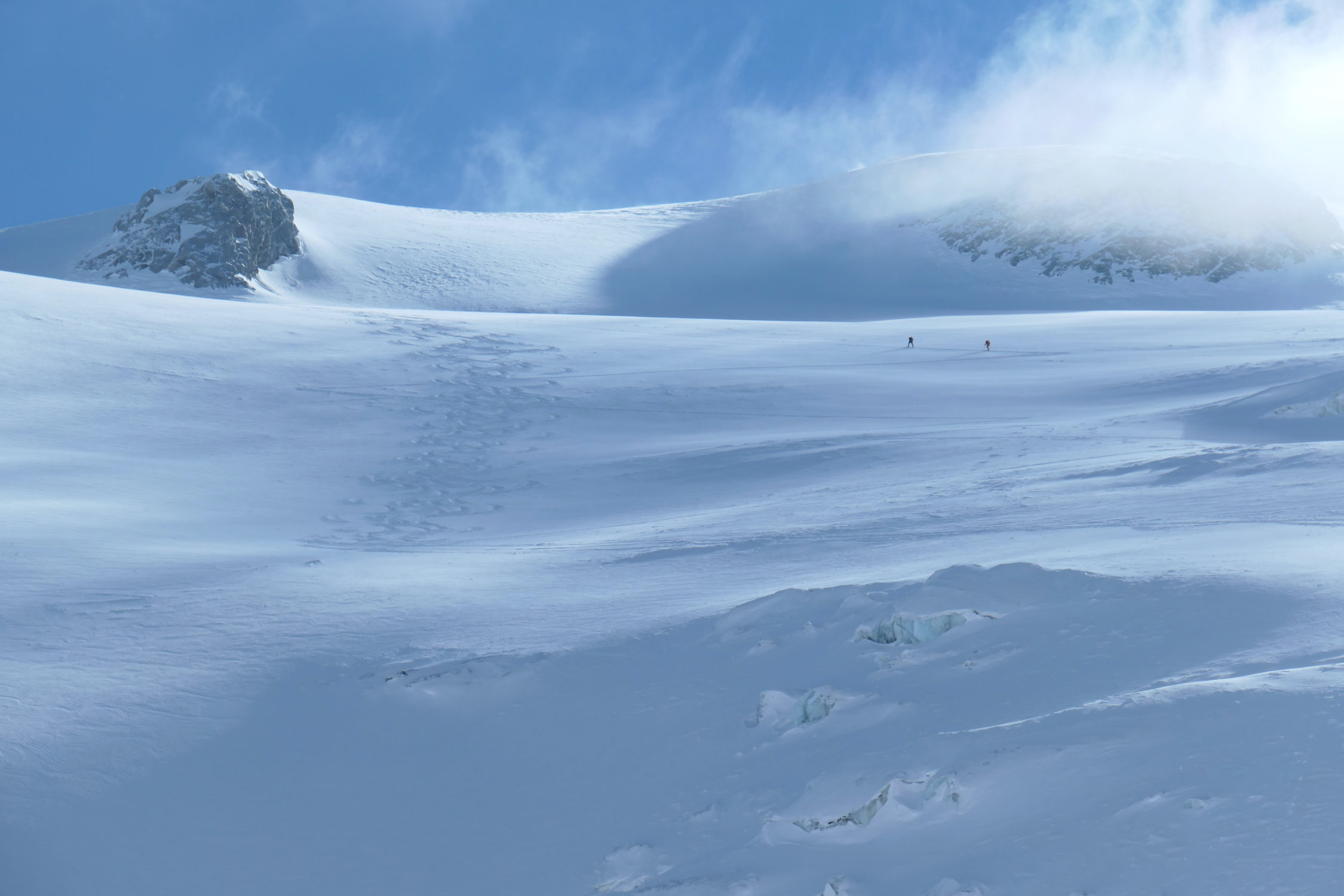 Am Gipfel Skidepot auf dem Vorgipfel 3273, oder in der folgenden Einsattelung. Für den Gipfel sind Steigeisen und evtl. Seilsicherung sinnvoll. Auf dem Gletscher sind wir ohne Seil aufgestiegen und abgefahren.