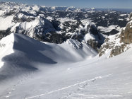 Super Verhältnisse auf dieser eindrücklichen Traverse. Der Normalweg ist perfekt eingespurt (teilweise etwas gar steil für meinen Geschmack). Die Ketten oben liegen grösstenteils frei, ich ging ohne Steigeisen/Pickel hoch, es lohnt sich aber diese auf alle Fälle mitzutragen.