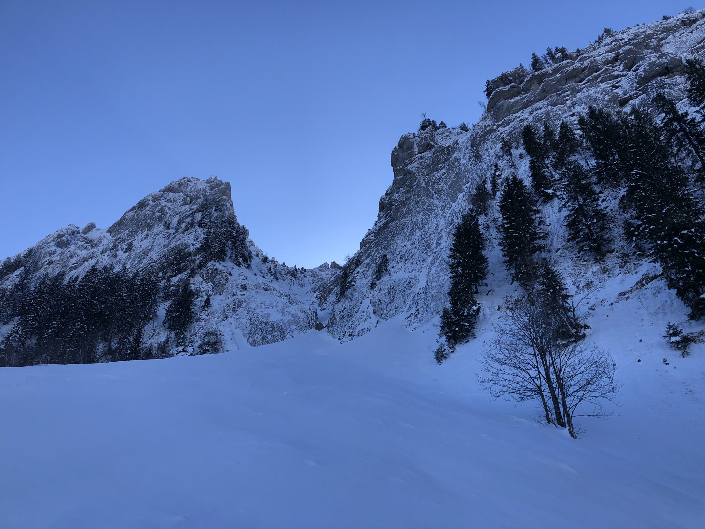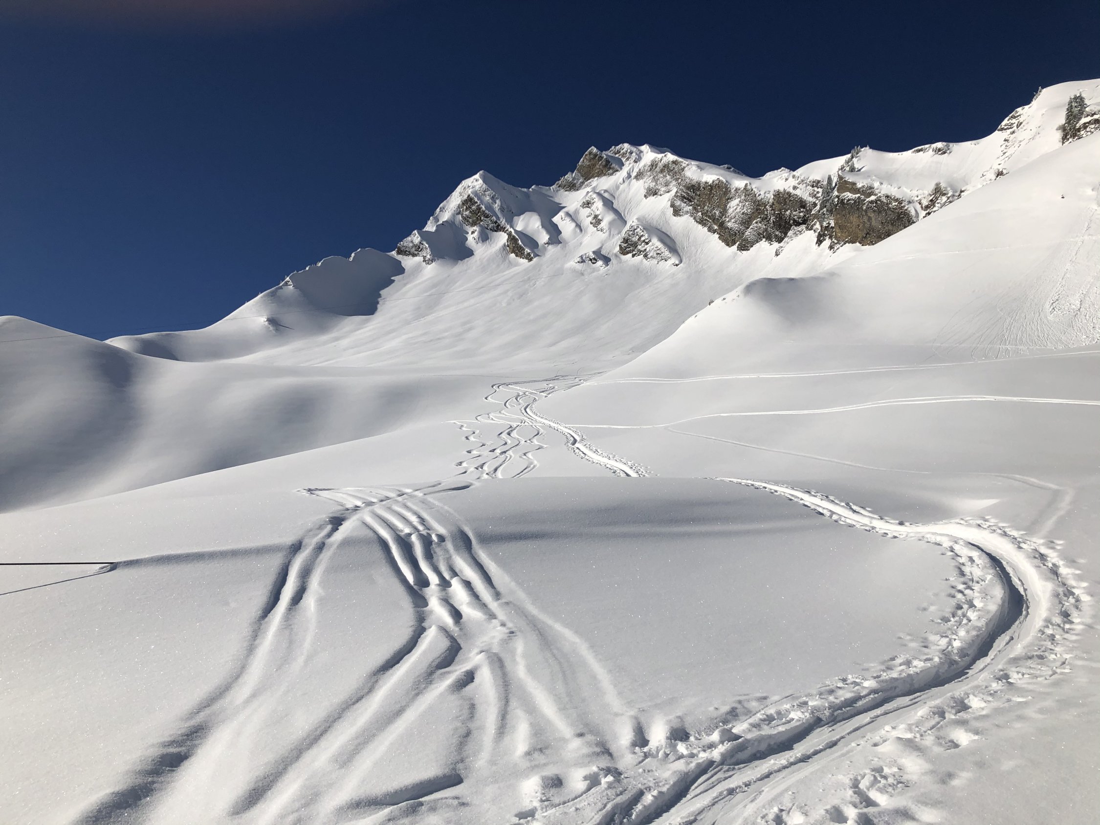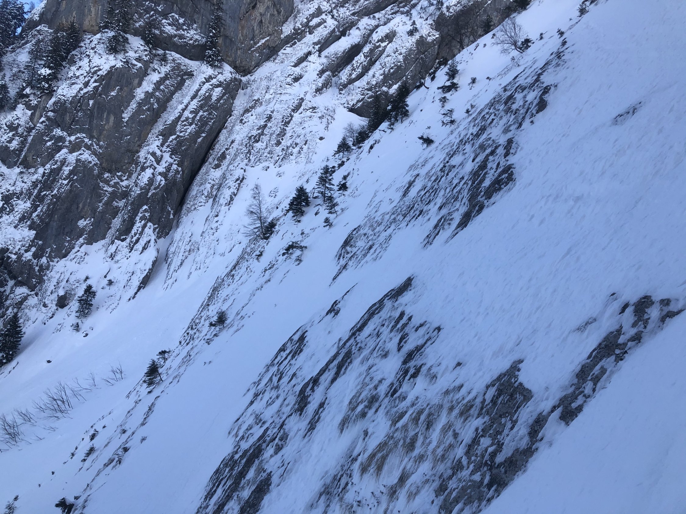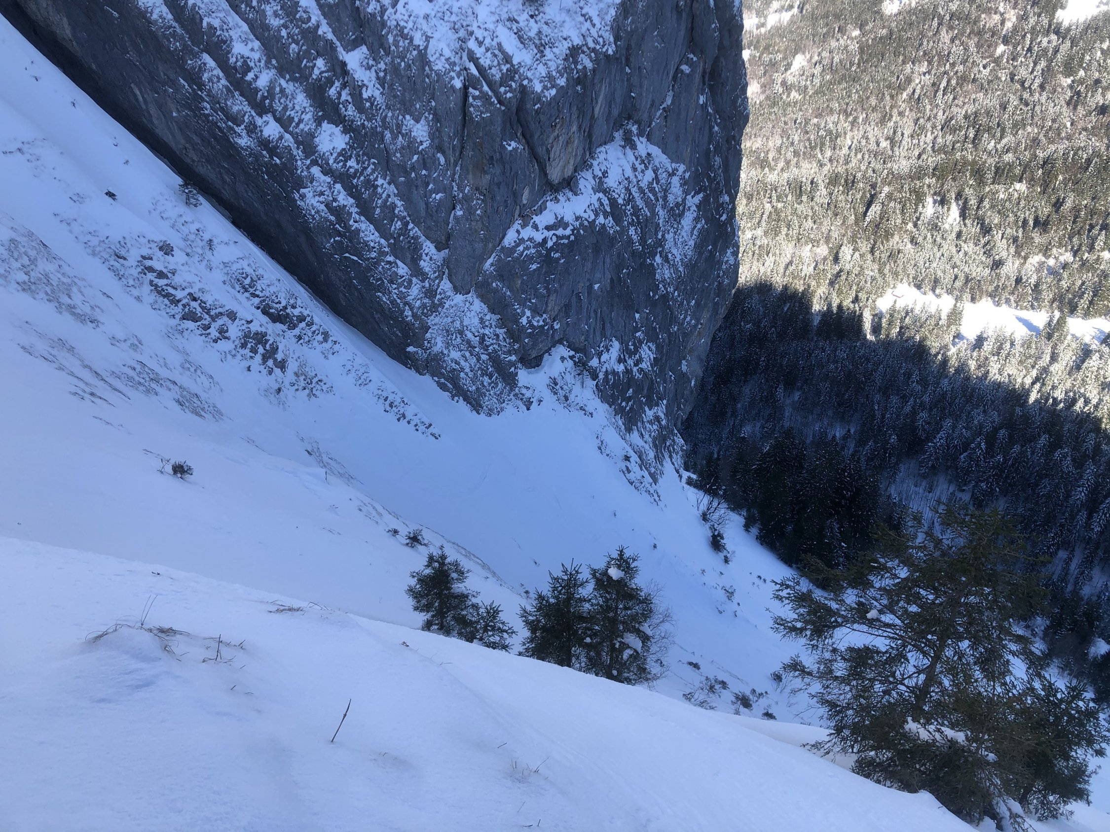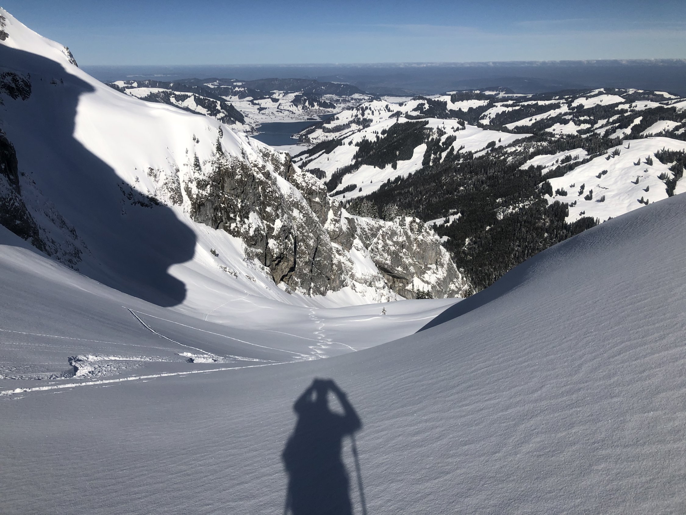 Während der Schnee in den E-exponierten Hängen bereits etwas schwer wurde um 10 Uhr, herrschten in der Gross Sienen noch perfekte Verhältnisse! Vor mir nur eine Spur, also genug Platz für grosszügige Turns. Oben noch breit und wenig steil, wird es wilder, je weiter runter man kommt. Die Schlüsselstelle ist wirklich steil, aber nur kurz und nicht ausgesetzt. Aktuell kommt man gut mit den Skis runter, auch wenn es überraschend wenig Schnee hat an dieser Stelle. Hinweis: Es lohnt sich unbedingt ein Seil (30m) mitzutragen, denn bei wenig Schnee kommen unangenehme Platten zum Vorschein. Es hat aber genug Bäume um abzuseilen.