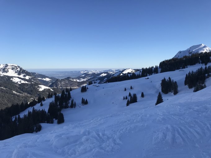 Vom Gipfel bis zur Fahrstrasse Pulverschnee mit wenigen Ausnahmen im Bereich südexponierten Hänge bei der Lufthütte.
