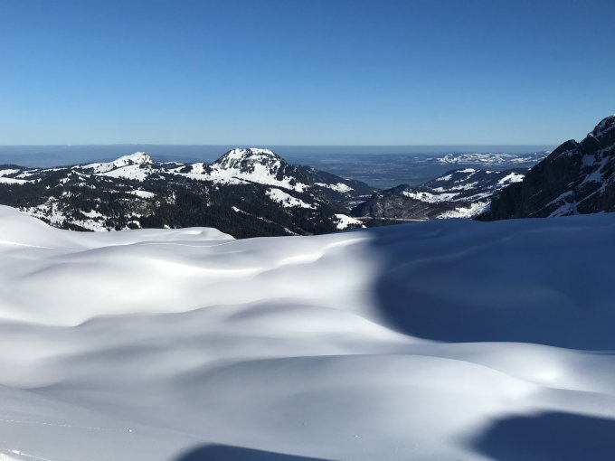 An den sonnenbeschienenen Hängen hat sich eine schwache Harschschneekruste gebildet (ca. 5cm). In der schattigen Nordflanke und in den tieferliegenden Nord-West-Hängen liegt nach wie vor Pulverschnee.
