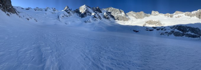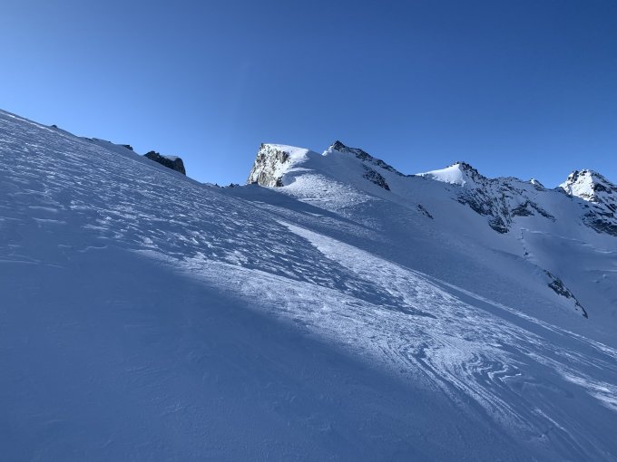 Gestartet 6:25 Fornohütte. Praktisch immer harte Unterlage. Südhänge unterhalb Monte Sissone hatten warzenschweinartige Oberfläche, recht ruppig. Etwa 200 Hm oberhalb Bivac Kima harscheisen montiert, ohne war es recht rutschig. Der Wind hat alles blankpoliert, Schnee wie auf Weltcuppiste. Gipfelgrat Monte Disgrazia neu eingespurt, oben knietiefer Pulverschnee. Achtung - im Bild mit der Gratübersicht Monte Disgrazia ist eine markante Wächte erkennbar. Ich meinte, meine Spur ausreichend tief gelegt zu haben. Das war ein Trugschluss, ein deutliches Knacken liess mich die Spur einen Meter tiefer legen. Hier unbedingt die tiefere Spur nehmen!