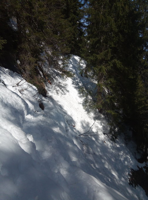 Ich bin für den Abstieg bei der Gratlücke nach Ober Roggen runter (bei Frühlingstemperaturen schon früh Gleitschnee-Gefahr) um die Alpstrasse Roggenhütte - Roggenegg zu erreichen.