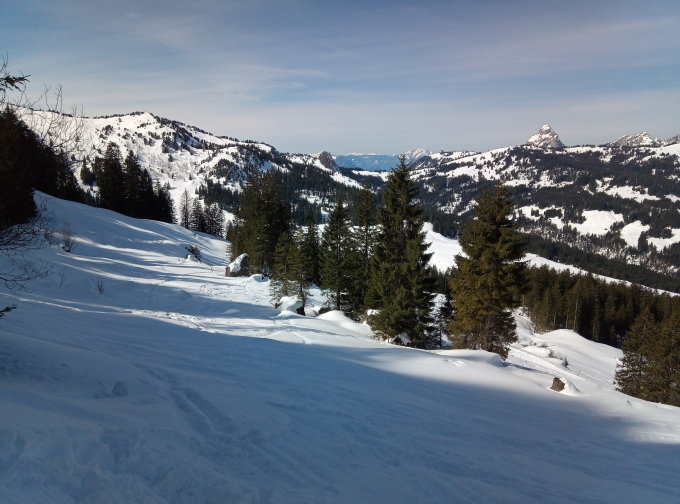 Dicke Schneedecke, Pulverschnee. Für ein so gut erreichbares Tourenziel sind die Hänge relativ "schwach" verspurt.