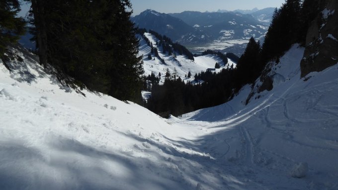 Zur meiner Verwunderung den ganzen Vormittag alleine unterwegs. Gestern Abend habe ich die Grünten NW-Flanke eingesehen(Fernglas)von Zuhause. Da war alles umgepflügt auf der gesamten Breite und das ist durchwegs sehr anspruchsvolles Gelände. Umso erstaunter war ich heute, dass am Steineberg oben gerade mal eine Abfahrtsspur vor mir drin war !