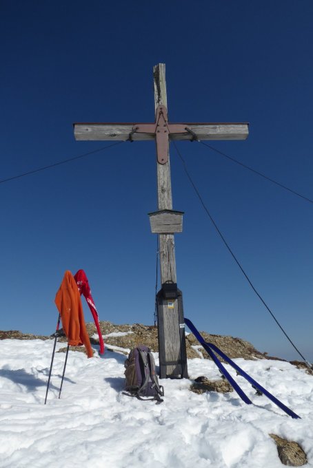 Start 7:30 Gunzesried Ski getragen bis über letzen Hof am Beginn der Hohlgasse. Auf z.T. harter Fuß-Schneeschuh Spur über Dürrehorn-Vord.Krumbachalpe hoch zum klassischem Anstieg vom Mittag her. Nun auf guter Skispur die oben sehr flotte(schmale) Rinne zum Kreuzgipfel und weiter zum höchsten Punkt. Abfahrt nach SO vorbei an Grathöfle, Dürrehorn, Winkelwiesen zur Talstrasse. Abfahrt um 10h oben noch gut aufgefirnt aber nach Grathöfle durch Wald bis runter schon sehr Nass, z.T.bremsend. Man muß zur Zeit schon sehr früh gehen um bei Abfahrt nicht abzusaufen. Ausstiegsrinne hatte ganz oben noch gesetzten Pulver. N-(O)Seiten vermutlich die bessere Abfahrtsvarianten.