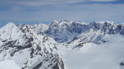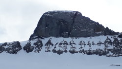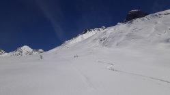 Der weitere Aufstieg ging problemlos, ich habe bei 2800 m das erste Couloir von links genommen wo es guten Trittschnee hat. Oberhalb des Couloirs sehr abgeblasen und hart hier Harscheisen sehr empfehlenswert. Ich konnte mit Ski bis zum Gipfel. Abfahrt oben hart, ich bin das dritte Couloir von links abgerutscht/abgefahren was recht gut ging. Darunter bis 2000 m wunderschöner Firn, es hat noch viel viel Platz für Spuren.