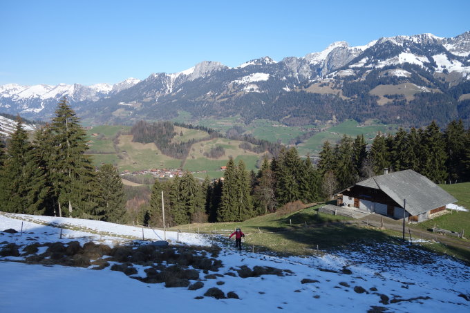 Gestartet auf 1050 m nahe der alten Skihütte von Worb (Löh oberhalb Bächlen), ab hier nur ein kurzes Tragestück im Aufstieg. Schnee war am Morgen noch hart eigentlich bis obere Drune. Zum Grat hoch schon langsam am auffirnen, oben noch etwas Bruchharsch, mit Ski gut bis zum Gipfel. In den Nordhängen lag noch Pulver.