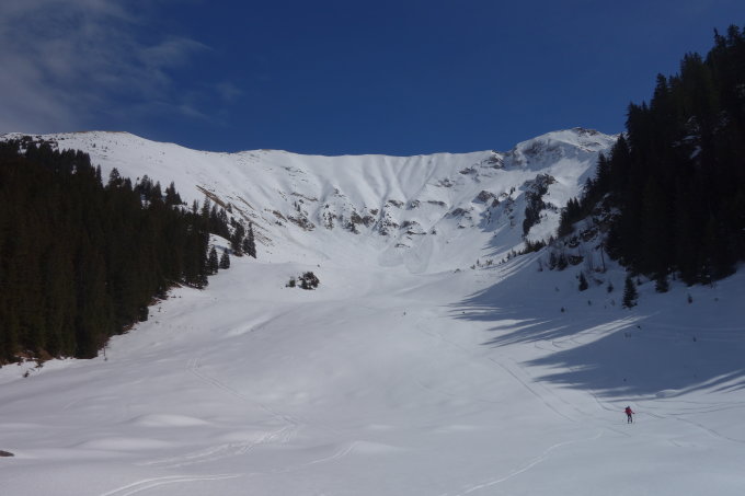 Abfahrt gegen 13.00 noch recht gut, teils schon stärker aufgesulzt, nur oberhalb 2300 m war der Schnee noch hart.