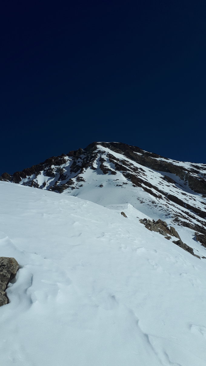 Gletscher ist gut eingeschneit. Auf ca. 3400 haben wir kurz die Steigeisen angezogen statt zu queren. Am Grat liegt viel Schnee. Gute direkte Spur im Trittschnee. Danke den Bergsteigern vom Vortag. Der Schnee zum abfahren war gut.