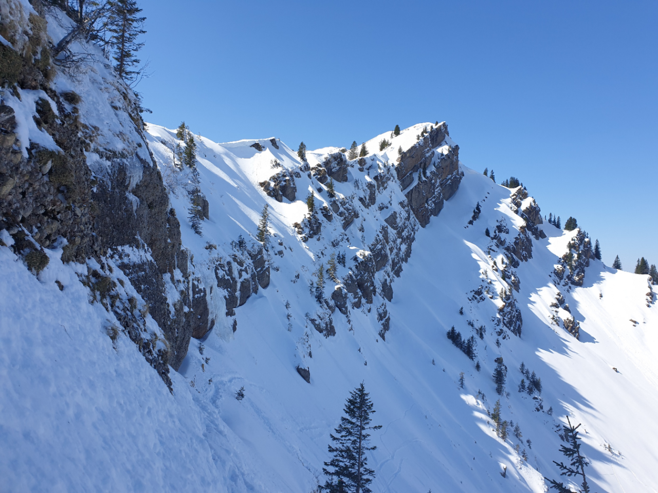 Die Route ist wegen dem steilen Wald und vieler Steine die bereits aus dem Schnee lugen für die Abfahrt nicht empfehlenswert.