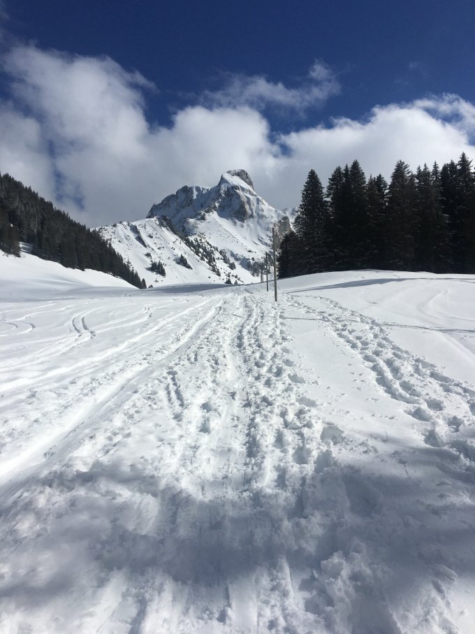 In der Nordflanke in der steileren Einfahrt (westlicher - näher zum Gipfel) nach zwei Metern kleines Schneebrett ausgelöst. Daher doch dann noch zurück geträppelet und die östlichere und etwas weniger steile Einfahrt genommen...