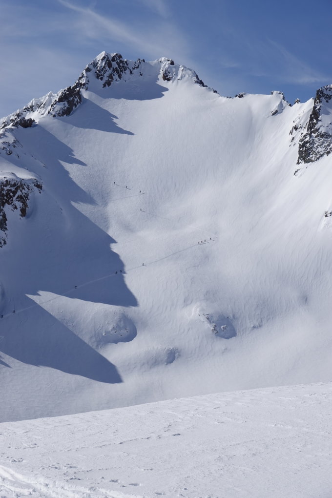 Super Pulver von oben bis zur Bludenzer Alpe. Gipfelhang wurde heute ziemlich zerfahren. Dafür alles safe. Der Südhang auf die Krachelspitze welcher das einzige Problem in puncto Nassschnee wäre, war heute um 11 noch sehr hart.