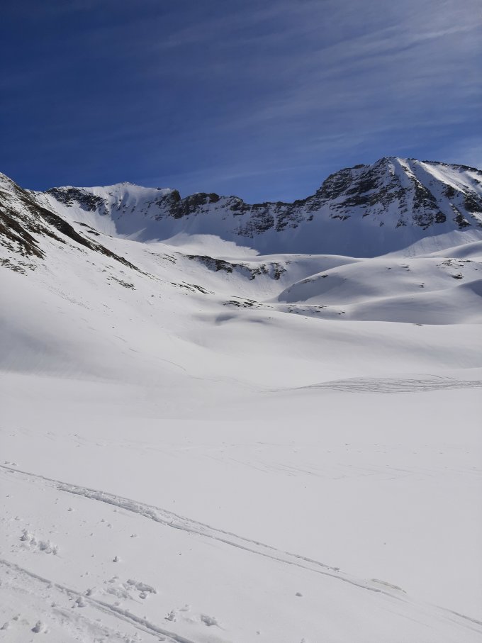 Die Abfahrtsvariante via Rücken oberhalb Punkt 2417 und dann westlich in den Hang traversieren war heute super. So kann man dem "vercharete" Gipfelhang ausweichen.