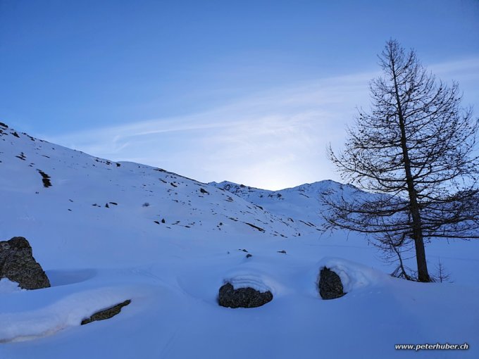 Tolles Wetter, warm. Noch sehr viel Schnee ab dem Parkplatz. Am Samstag und in der letzten Nacht hat es hier keinen Neuschnee gegeben.