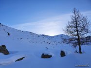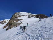 Aufstieg auf hart gefrorenem Schnee. Mit den Skis bis fast auf den Gipfel.