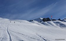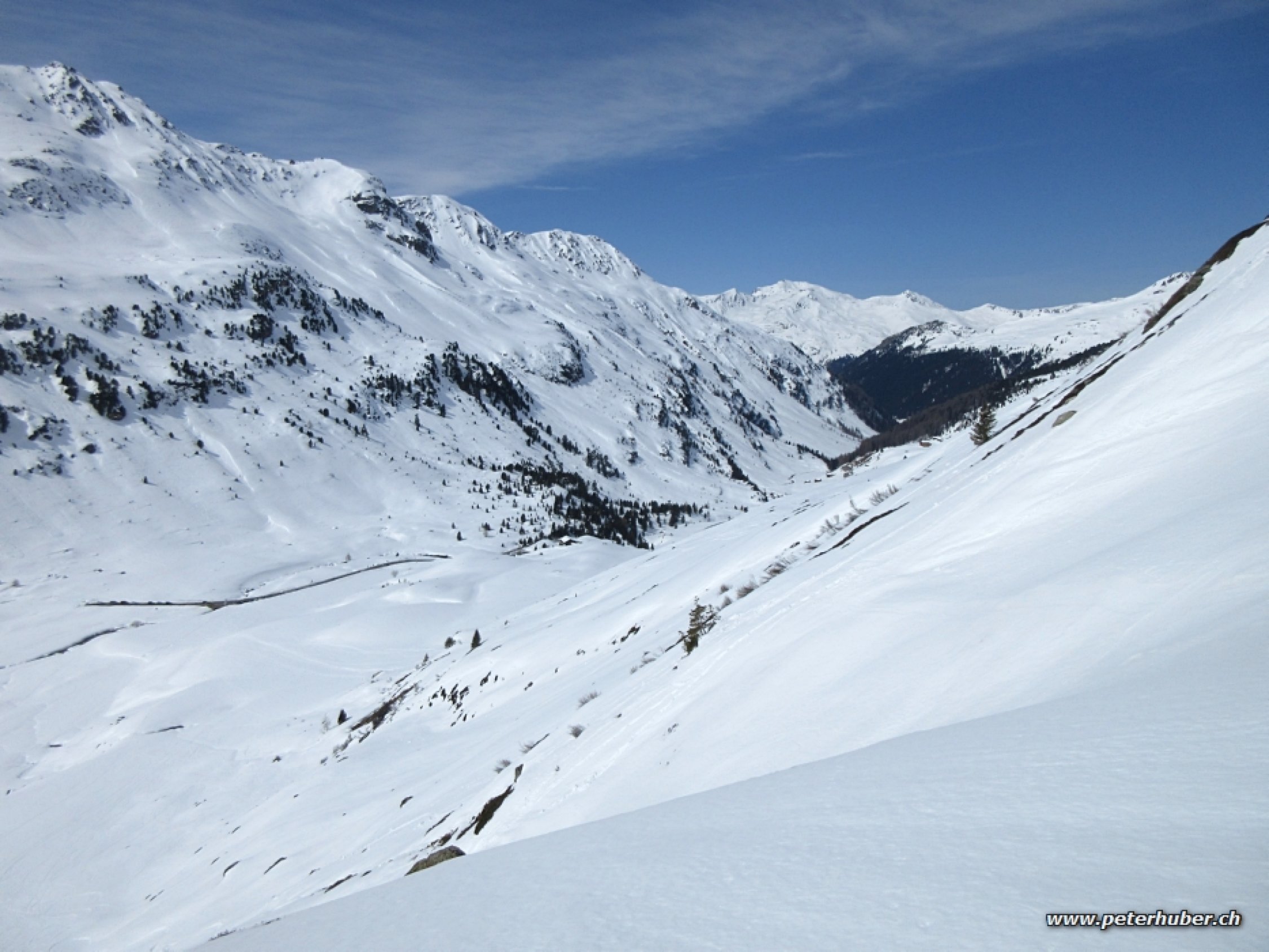 Abfahrt: Oben wenig Pulverschnee. Dann hart tragend, gut. Ab der Mitte schöner, unten traumhafter Sulz. Start zur Abfahrt um 12 Uhr war gut.