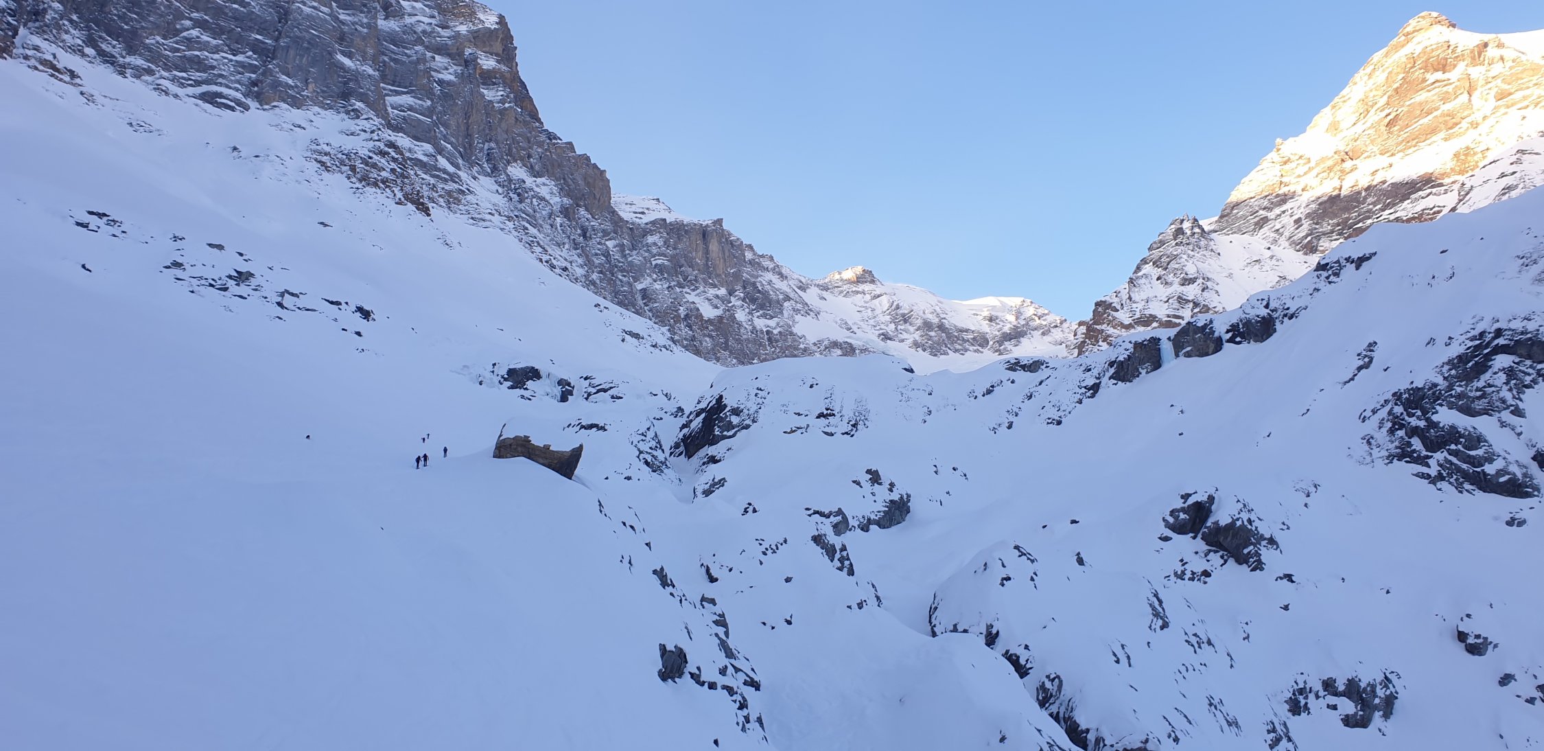 Nach einer sehr kurzen Nacht, Start am 4.45 Uhr bei Tierfehd, die Ski konnten sofort montiert werden, schnelle leicht glasige Spur bis Hintersand, der Aufstieg durch den Wald war etwas mühsam, schon bald wurde es wieder griffiger, der erste Abruch wurde links bei gutem Pulverschnee umgangen, der zweite Abruch