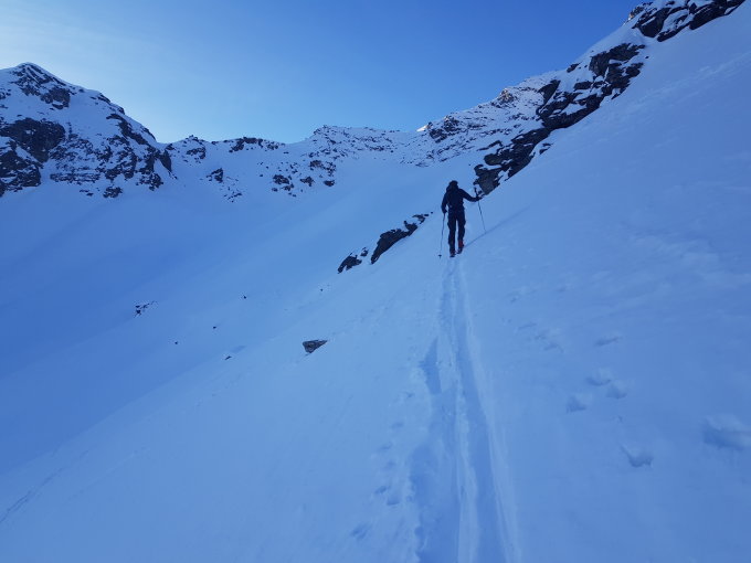 Von Maloja gestartet. Bis zum Einstieg ins Couloir gute Aufstiegsspur. Die Harscheisen haben wir heute nicht gebraucht, trotzdem könnten sie im letzten Hang vor dem Couloir oder bei anderen Abstrahlungsverhältnissen evtl. angenehmer/ratsam sein.