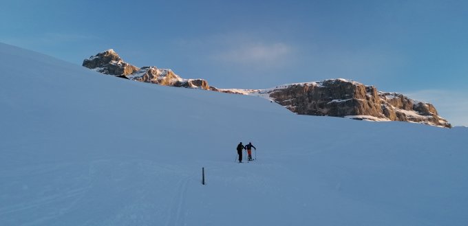 Guter Trittschnee im Gemschtobel. Harscheisen könnten nach der Erwärmung hilfreich sein.