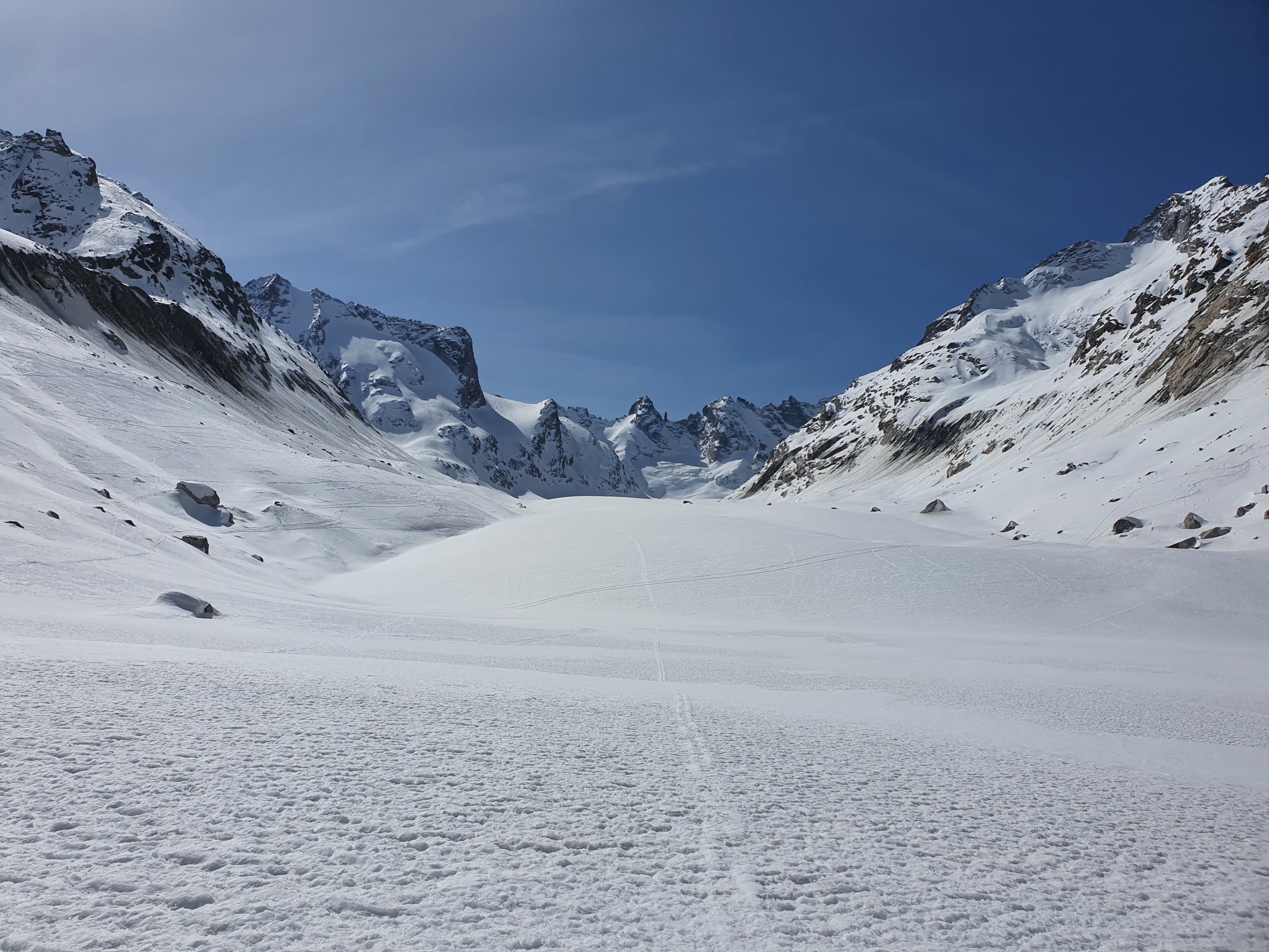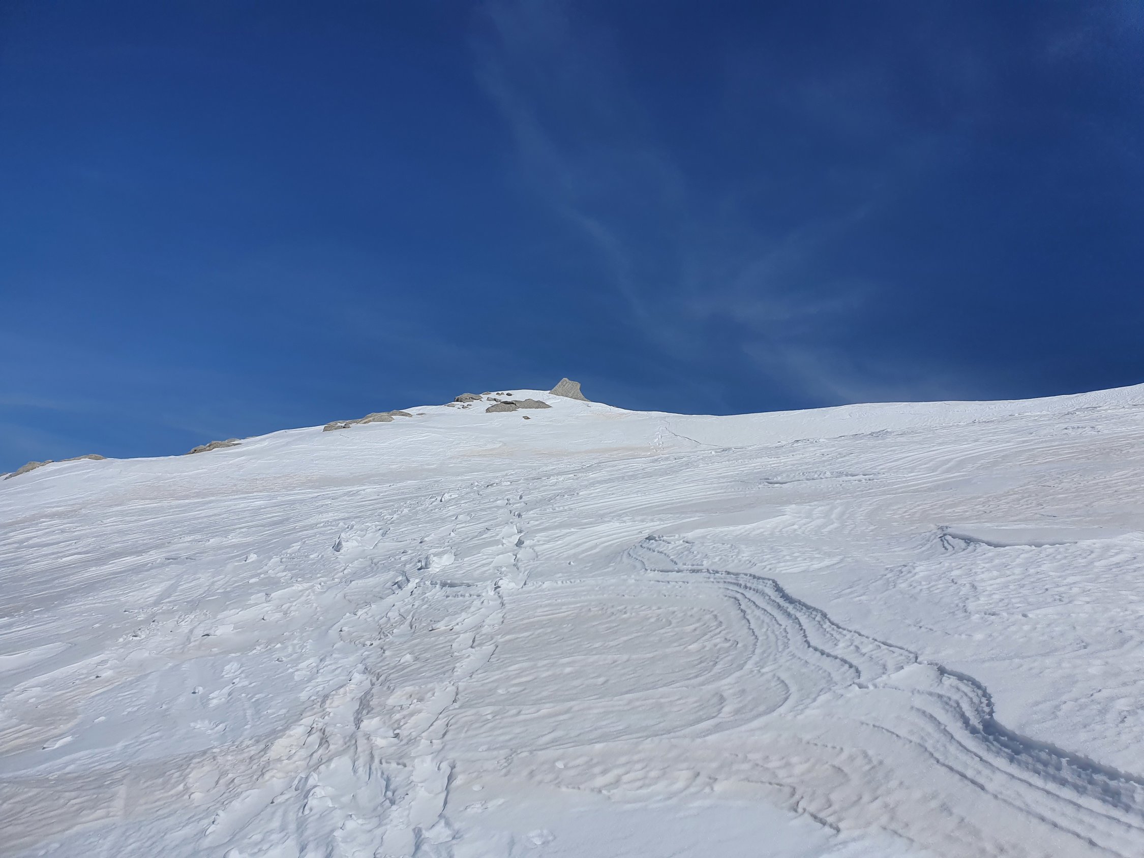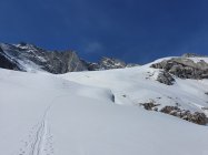 Langlaufloipe bis Plan Canin (P1975)! Danach bis ca. P2600 ziemlich falche Tour, v.a. bei der Abfahrt ist unter der Fornohütte Stossen angesagt, da man am späten Nachmittag einsinkt... Danach geht's aber dafür richtig hoch. Bei ca. P3100 müssen wegen einer kleinen Steilstufe die Skis kurz abgezogen werden (ohne Steigeisen am Nachmittag machbar). Dann gemütlich weiter zum Pass. Die Abfahrt vom Pass bis zur Bocchhetta dal Castel habe ich mit Fellen auf Hartschnee gemacht (war etwas faul); hier eine grössere Spalte sichtbar. Ab dort ist der Schnee weiterhin hart, wenn sogar auch schon etwas glasig. Mit den Skis bis ca. P3200 machbar, danach bin ich mit Steigeisen hoch. Die letzten 5 Meter vor der Madonnastatue habe ich aus ängstlichen Gründen ausgelassen. Ich habe dann die Skis kurz etwas hinab getragen, um nicht wieder ab- und auffellen (da weiterhin faul ;o))) zu müssen, und bin wieder hoch zum Passo dal Cantun. Hier Skidepot bei ca. P3280. Dann mit Steigeisen hoch zum Cima dal Cantun Südgipfel. Ich bin noch etwas weitergegangen, aber dann war Schluss (siehe GPX). Bis zum Cima dal Cantun Hauptgipfel sieht es sehr anspruchsvoll aus.