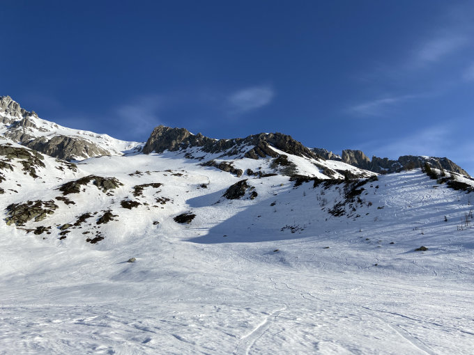 Die Steilstufe über der Hütte ist z.T. aper. Ich fand es am einfachsten zu Fuss über die Felsen aufzusteigen und auf der Spur ebenfalls zu Fuss zu queren. Der Rest vom Parkplatz bis zum Skidepot ist mit Ski machbar. Bei Start 8Uhr sogar alles gut ohne Harscheisen - die Steigung zum Skidepot war allerdings knapp weil 10.30Uhr noch gefroren. Überwiegend guter Trittschnee im Couloir aber Steigeisen und Pickel notwendig. Abfahrt kurz vor 12 Uhr genau richtig, oben gerade aufgefirnt und unten noch nicht zu sulzig - naja knapp.