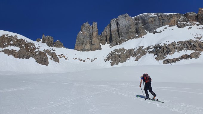 Aufstieg rechts vom Rossbach auf sehr hart gefrorenem Schnee, alles im Schatten bis 2400 m. Abfahrt um 13 Uhr über den Chüefadfirn. Perfekte Sulzverhältnisse, eine Traumabfahrt. Ufpasse am Nachmittag, grosse Nassschneelawinen haben sich von den felsigen Sonnenhängen ergossen.
