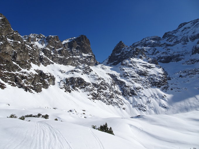 Abfahrt ab Kröntenlücke zurück zur Hütte mässig lohnend, sulzige Osthänge suchen, Nordhänge sind pappig