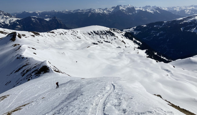 Der Aufstieg wie gewohnt fast wie über eine Skipiste. Die Traverse vom Hüeneri über den Madchopf zum Langrain geht sehr gut und kann durchgehend mit den Ski gegangen werden.