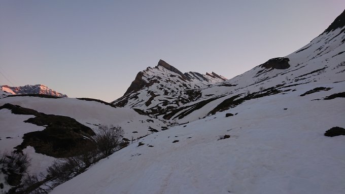 Start um 6.40Uhr in San Bernardino in der Nähe des Skiliftes. Schnee hart und ruppig = Sommerschnee. Einige grüne Stellen muss man schon umgehen.