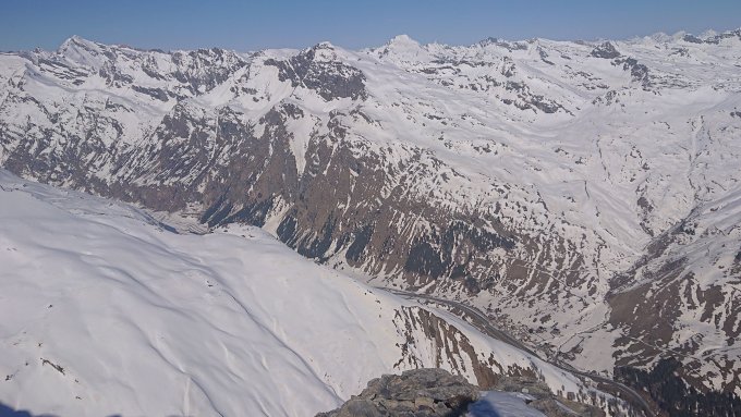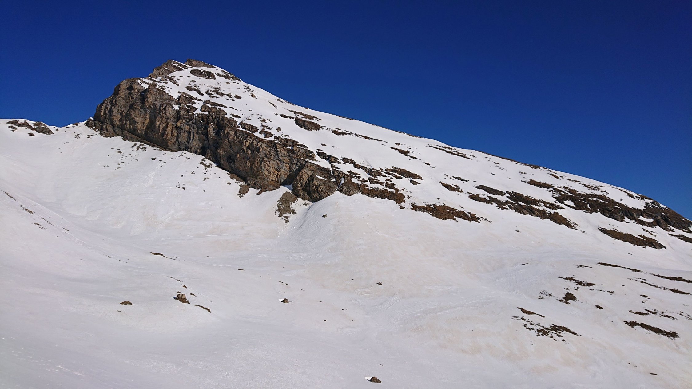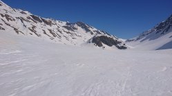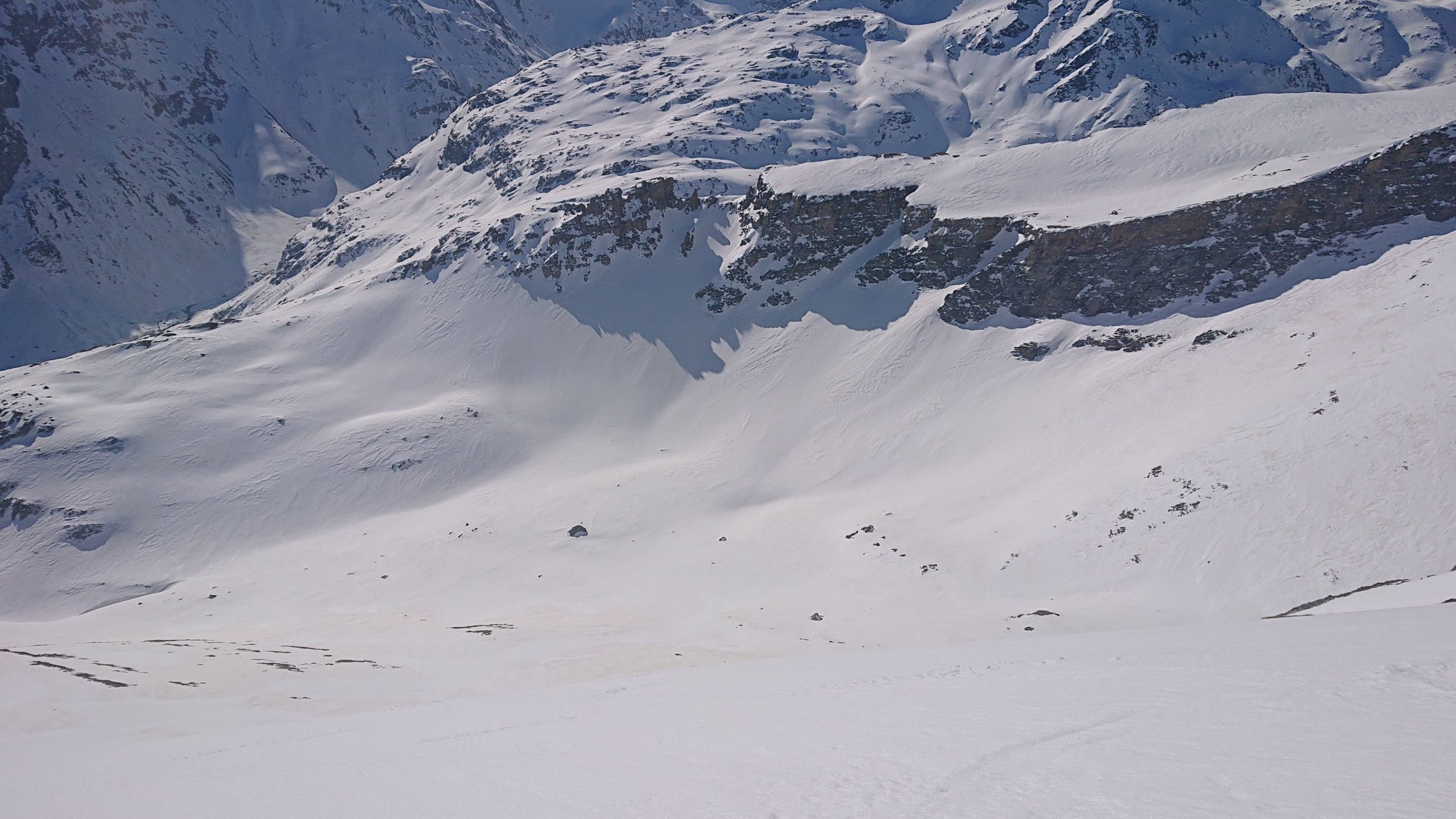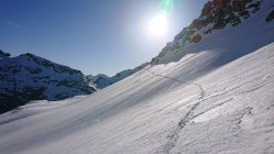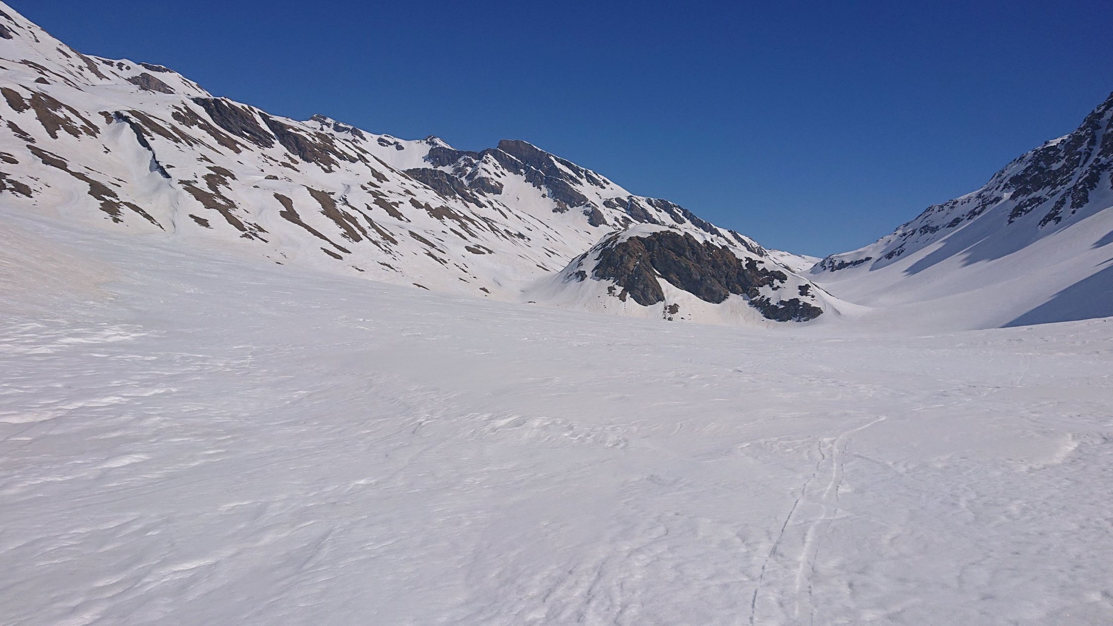 Rückfahrt nicht entlang der Aufstiegsroute und auch nicht die Südhänge querend, sondern alles abgefahren bis P.2295 und an den Nordhängen südlich vom Bach das Tal hinausgegleitet.