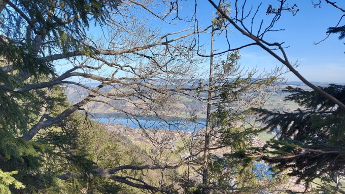 Die Aussicht am Gipfel ist wegen der Bäume nach Süden beschränkt. Schöner Blick auf die Alpseen und die Hörner-Gruppe bis zum Alpstein.