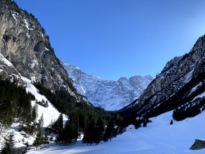 Start um 7:30 Uhr - super Schnee auf der Strasse nach Brunnialp. Wir hatten super Glück, dass zwei Einwohner von Unterschächen sehr früh gestartet sind und die ganze Route tiptop gespürt haben. Trotz der relativ kalte Temperaturen der vorangegangenen Tage ist die Sonnenseite der Ruchchälen bereits gerutscht, deshalb hatten wir keine Angst vor einen späteren Absteig. Noch super Schnee bis zum Skidepot und perfekter Trittschnee bis zum Gipfel, obwohl Steigeisen und Pickel immer noch schön zu haben waren. Erste 100hm windgepresst, dannach super Pulver für 1500hm!! besonders in der Schattenseite der Ruchchälen.