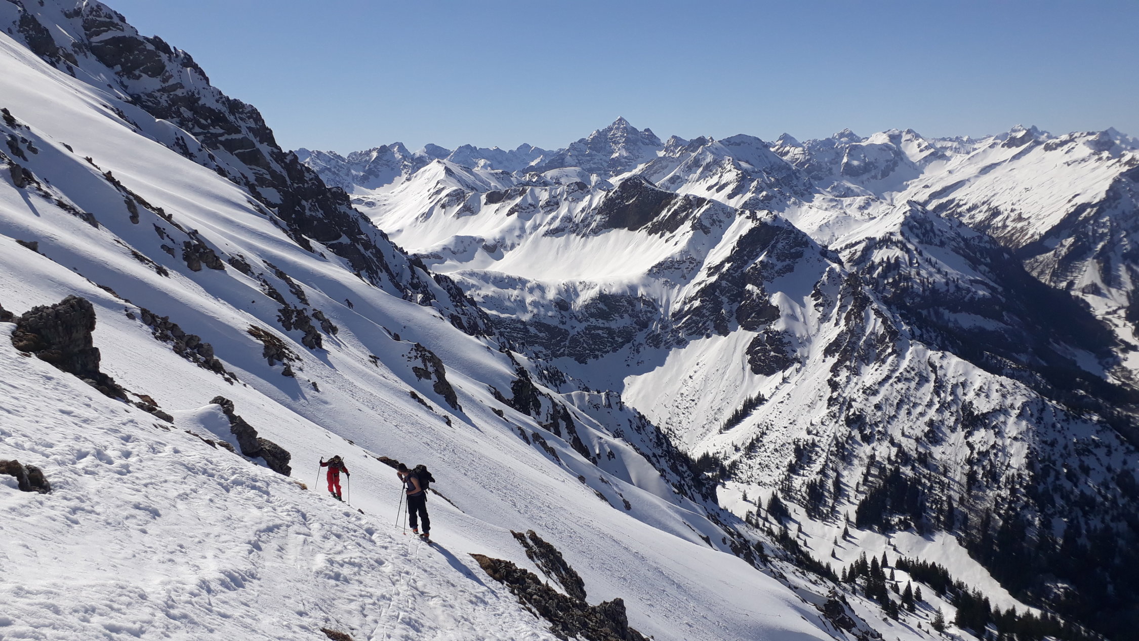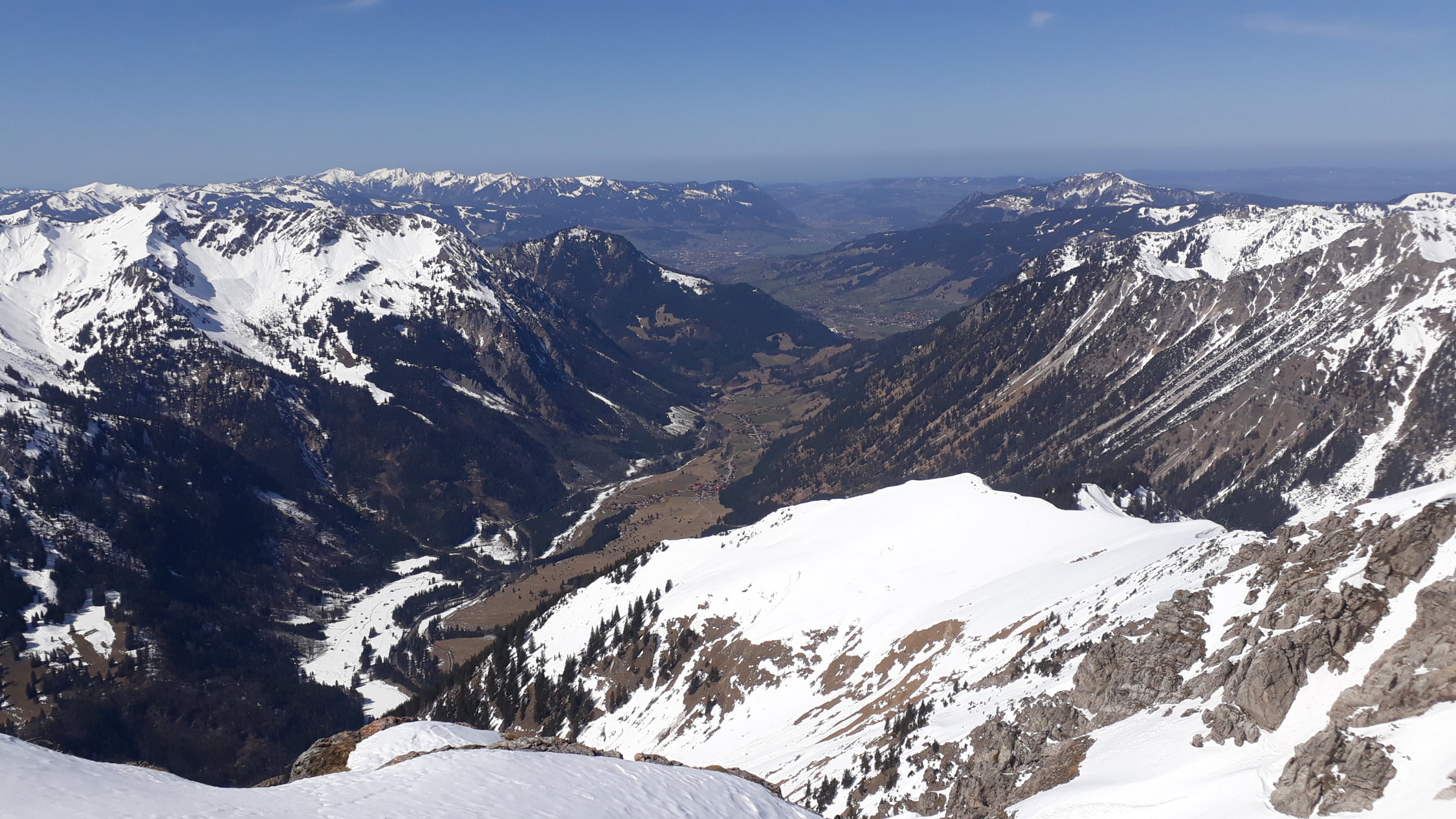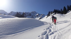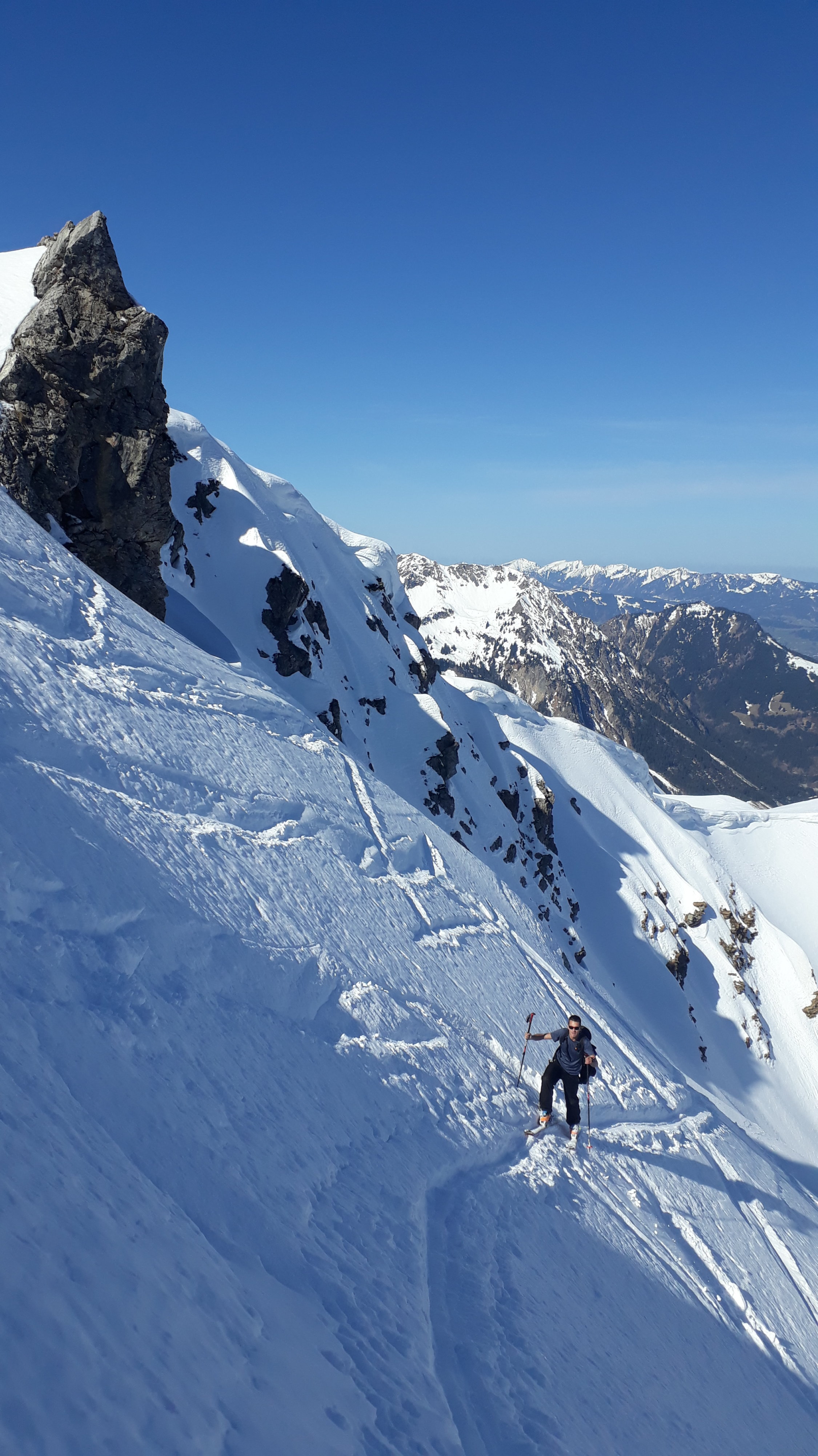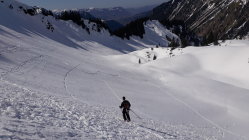 Mittlerweile Frühjahrsverhältnisse, d. h. wir haben bis kurz vor dem Talkessel der Willersalpe die Skier getragen. Ca.100 Hm unter dem Talkessel im Wald die Skier angelegt und durch morgens griffigen Weichschne mit Deckel aufgestiegen. Gleich nach Erreichen des Talkessels nach rechts und unter dem Gernkopf hoch bis zum Riesenhang. Hier im unteren Drittel auf eine gute Spur von links getroffen und steil, aber dank der Spur sehr bequem bis aufs Plateau. Danach bei der Querung war der Schnee hart, aber bereits leicht angefirnt (Harscheisen nötig). Am Gipfelaufbau noch ein Stück mit Skiern hoch, dann zu Fuß weiter. Für die Gipfelbesteigung war ein Pickel ausreichend. Bei der Abfahrt war die Querung zum Plateau aufgefirnt, deswegen gut befahrbar. Im Riesenhang haben wir uns ganz links gehalten und noch tollen Pulverschnee genossen. Weiter unten dann in der Sonne immer weicherer Schnee, ganz unten Nassschnee.