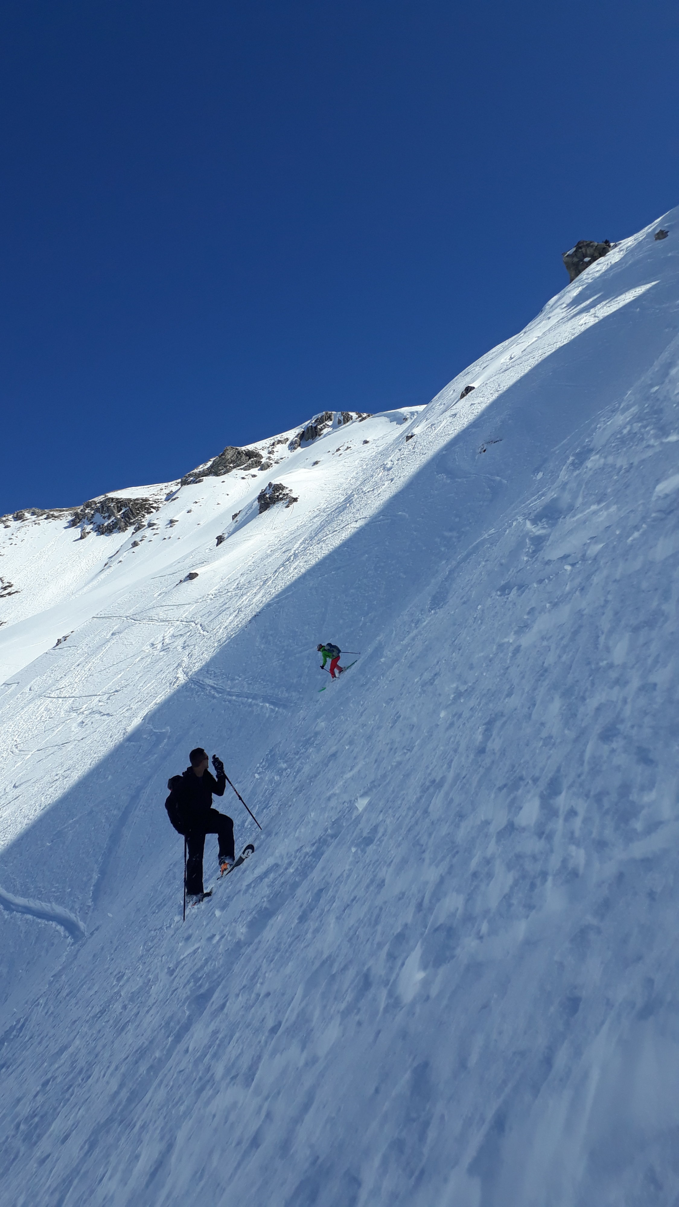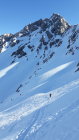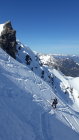 Wenn man bereit ist, immer weiter die Skier hochzutragen, dann noch einige Zeit machbar. Insgesamt nicht übermäßig sonnenempfindlich, deswegen muß man auch nicht um 5 Uhr morgens losgehen. Der steile Riesenhang ist durch seine Nordausrichtung im Augenblick lawinensicher. Landschaftlich sehr empfehlenswerte Tour mit alpinem Anspruch im Gipfelbereich.