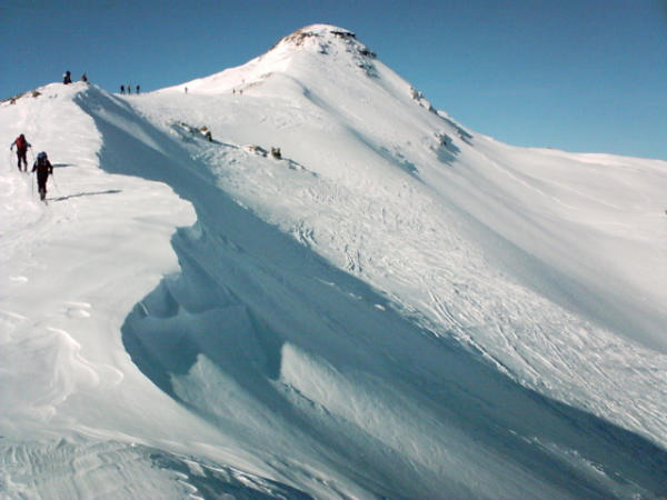 Was ist passiert ? Noch vor 2 Tagen, am Freitag, hatten wir den schönsten Pulver der Welt. Wir denken Jahre zurück und können uns nicht erinnern, je so einen fantastischen Pulverschnee erlebt zu haben. Doch heute war alles ganz anders. Vom traumhaften Pulver war nur noch ansatzweise etwas da. Die Abfahrt vom Hühnerkopf bereits stark verspurt. Die Schneedecke oft verblasen und windgepresst. Dennoch konnte man zum Teil noch recht gute Schwünge ins Gelände zeichnen. Den landschaftlich sehr schönen und auch recht gemächlichen Aufstieg teilt man mit einem bunten Tatzelwurm aus Tourengehern, Snowboardern und Schneeschuhfreaks. Daher mein Tip: Diese, über weite Strecken recht lawinensichere Tour, sofort nach Neuschnee, möglichst unter der Woche in Angriff nehmen.