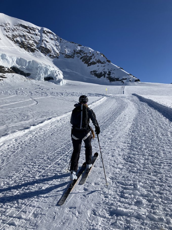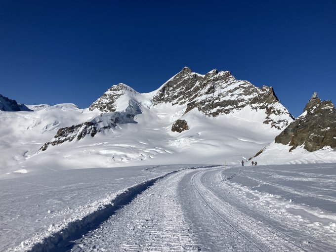 Wir sind mit der ersten Bahn hoch aufs Jungfraujoch, dann via Mönchsjoch, Ewigschneefäld mit möglichst wenig höhenverlust direkt durch die Gletscherbrüche hoch zur Route welche von der Konkordiahütte her kommt. Zur Zeit sind sehr gute Verhältnisse am Gross Grünhorn.