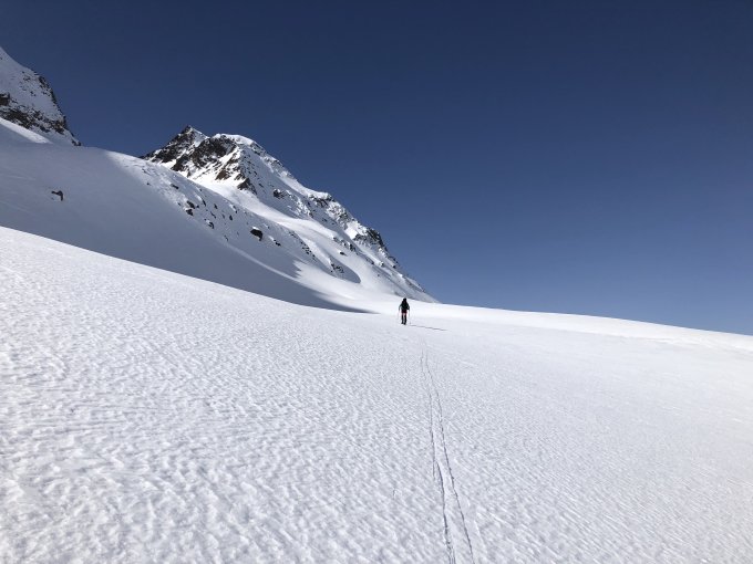 Die steile Querung zum Griespass haben wir am Morgen auf dem oberen Weg gemacht, bei der Rückkehr auf der steilen Flanke traversiert. Das Lawinenrisiko ist dort eher klein, da Nordseite und ziemlich windgepresst.