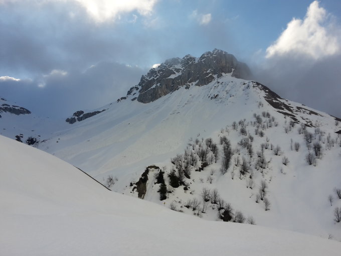 Start um 7:40 in St.Antönien Platz, Fussmarsch bis Rüti, anfellen und über die Wiesen hoch nach Matten. Da die nächtliche Abstrahlung ungenügend war, bricht man immer wieder leicht ein, eher mühsam. Ab Matten freestyle hoch bis Pkt. 1870, wo eine mehr oder weniger definierte Spur auszumachen war, Harscheisen bis ca. 2300m kein Seich. Die Hänge bei Äbi unterhalb der Gämpiflue waren mit m.E. recht frischen Rutschen übersäät, die Schollbergseite ist hingegen fast grün und schon recht "entladen". Gegen 10 Uhr am Joch angekommen verschwand die Sonne und bald war stockdicker Nebel mit Sicht 5m, yours truly hat auf die Besteigung des Gipfels in dieser Sauce verzichtet und stattdessen das formschöne aber namenlose Güpfi Pkt. 2539 "bezwungen". Danach Warterei in der Hoffnung, dass sich die Suppe endlich aufklare. Um 11+ schien sich der Deckel zu lüften, Abfahrt auf die Partnuner Seite: anfangs hart aber nicht eisig, war weiter unten bald alles recht eisig und recht mühsam zu fahren, ein Dauerkratzen auf den Kanten. Über Tällisch Bord und Pöschenwang nach Partnunstafel, natürlich bei schönstem Sonnenschein... Ab Partnunstafel ereignislos der Strasse nach zum PP.