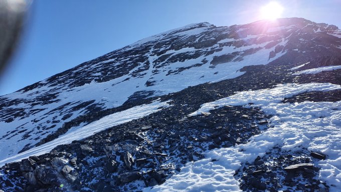 hart, aber grösstenteils Spur brauchbar. Letzte 600 Höhenmeter durch das Nordcouloir hinauf (ohne Ski), da oben relativ wenig Schnee und die Felsplatten z.T. vereist.